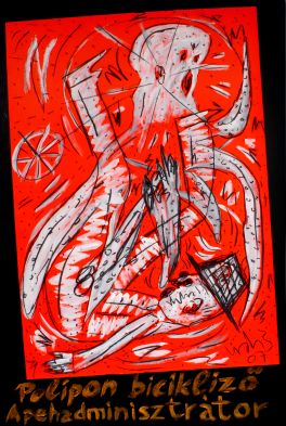 drMáriás legújabb alkotásain kettejük viszonyát követhetjük 12 nagy- és 20 kisméretű képen, azt a furcsa viszonyt, amelyben egyrészt Rómeó és Júlia szenvedélyes vonzódása, másrészt a törvények, szabályok, rendeletek és fizetési felszólítások kiismerhetetlen köde jelenik meg. Ebben a világban küzd meg a kihívásokkal és rémálmokkal nap, mint nap, s próbál ember maradni polip ás APEH-adminisztrátor egyaránt.