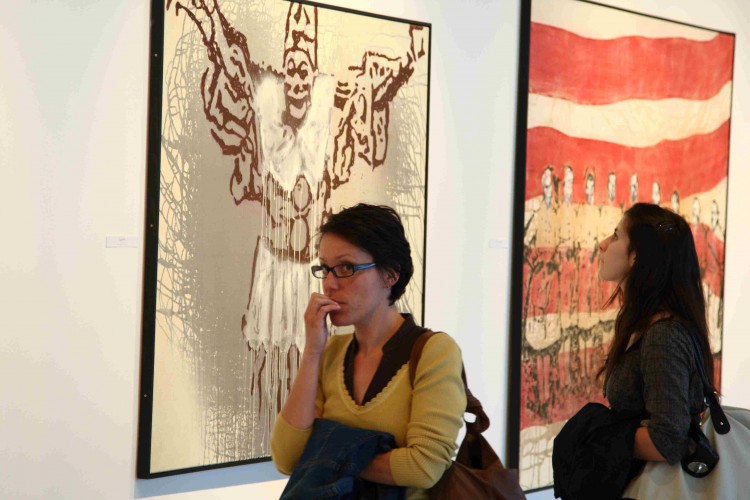 Mindezt persze nem csak az a néző kérdezi, aki egy kicsit el van már szokva a reprezentatív méretű, ikonszerű igényekkel fellépő, klasszikus technikákkal operáló, előtér-háttér-figura-kolorit viszonylatokban kommunikáló, mágikus realista festményektől, tehát aki a kortárs képzőművészet kapcsán nem mondjuk Peter Doigra gondol első lendületében (ami persze könnyen lehet, hogy fatális hiba), szóval ezeket a nagyon nyers, nesze-a-pofádba kérdéseket nem csak a megrökönyödött néző fogalmazza meg, hanem ezek a kérdések készen várják e festmények terében, épp úgy, mint rács mögött a párducok, mint falusi cirkuszban a rémisztő bohócok, és mint a közúti ellenőrök az út végén a kanyarban, vagy mint az asszonykórus a cirkusszal átellenes községháza előtt.