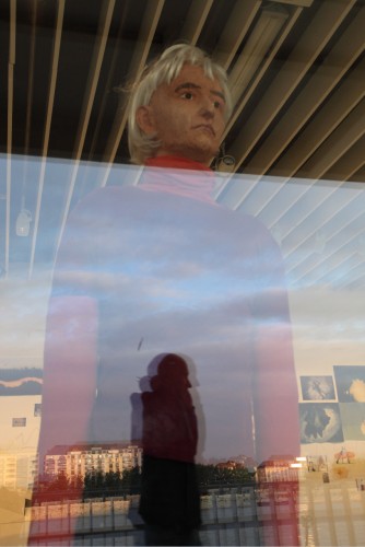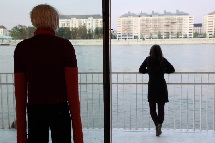 A nagy bábu sem néz ide, a gyorsan hömpölygő Dunát látja, bámul bele a vízbe. A kis önportré a táblát nézi a saját felirattal, a menetekellel, nem látja a képeket, tudja őket kívülről. Ezek a bábuk egyszerre érzékenyek és érzéketlenek – ők így hárman, mert ott van még a fekete puttonyos alak, Ottfried is – mindent tudnak és éreznek, de nem sírnak, nem mozdulnak, legfeljebb elmúlnak vagy eltűnnek.