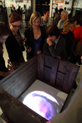 Látjuk még a periférián a színes grafikonokat, kitakarják őket a képek, szinte nem is látszanak. Olyan a fal így, mint egy kórházi lázlap, több színes, szabálytalan EKG-csík. Ahol a képek alatt eltűnnek a vonalak, ott a hiány van, nincs élet. Illetve, ha másként nézzük, épp ott látunk bele az életbe, ahol a vonal megszűnik, ott tárul ki egy metaforányi ablak, amin keresztül beleshetünk a dobozba. Nem is doboz teteje ez, hanem egy csapóajtó, amely egy pillanatra felnyílik, és egy rövid időre láthatóvá válnak a fogaskerekek, a hajógépezet, aztán visszacsukódik minden, az életvonal folytatódik.