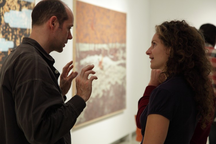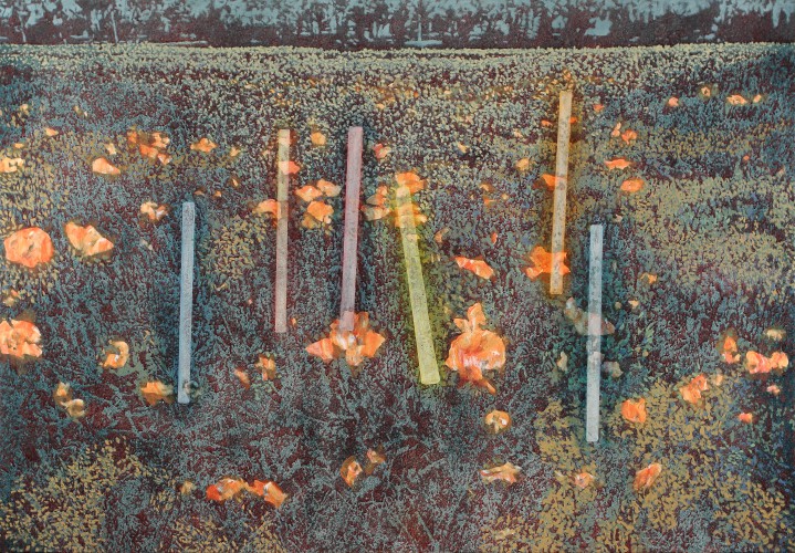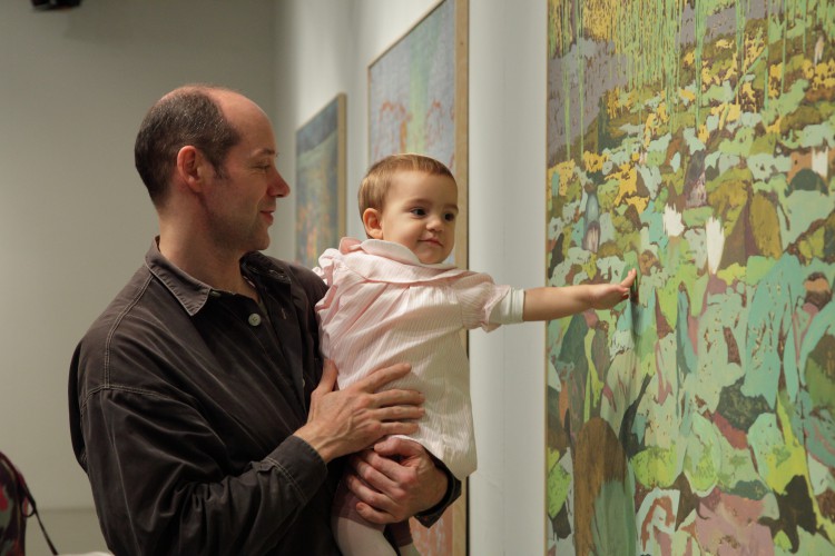 Valahol. A mostani kiállítás címe térbeliségre, valamely területre, vidékre utal, és teszi ezt a bizonytalanság, a keresés-kutatás érzetét keltve. Nagyvárosi tájképfestészet ez, áthatva a történelem lenyomataival. Leginkább egy militáns Monet-t képzeljünk el, aki a tavirózsák között felbukkanó hadi sisakokat megpillantva elhagyja az impresszionisták derűjét, és technikát vált.