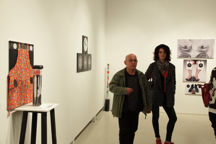 A kiállításon szereplő egyik művön Laca cipőit látjuk, közöttük olcsó gyöngykarkötők, és a szétírt home-oszt-ázis felirat.
