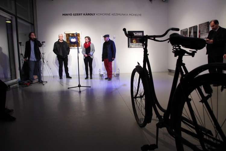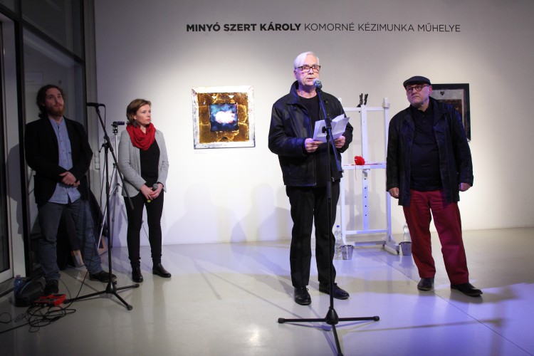 „Komorné Kézimunka Műhelye valós szolgáltató egység volt, a Régiposta utca 7-9. félemelet 4-ben működött a 60-as években, és kora ifjúságom alapképleteként minden lépcsőzésnél beexponálódott a fejembe a földszinti kis fekete, aranyszegélyes tábla látványa a fordulóban, ahogy gyerekként kettesével vettem a lépcsőket nagyszüleim házában. Főleg a kiírás zenéje vagyis inkább rigmusa fogott meg. Sok év elteltével az egyszerű, hétköznapi táblácska rigmusa visszatért! A névadóról nincs konkrét emlékem, egy gyermeki fantáziában kibomló kuszaság, valami, ahonnan akkor elrúgtam magam, hogy most megidézzem!”— így vall a művész, Minyó Szert Károly legfrissebb kiállításának címválasztási apropójáról. S ez az emlékfoszlány, illetve felidézésének módja sokat elárul Minyó szemléletéről, alkotási módszeréről, arról, ahogy e „beexponálódások” milyen nemes és rafinált módozatokban kerülnek nála előhívásra, majd milyen ékes és rendhagyó módon nagyításra.