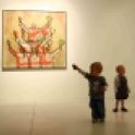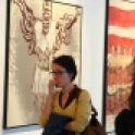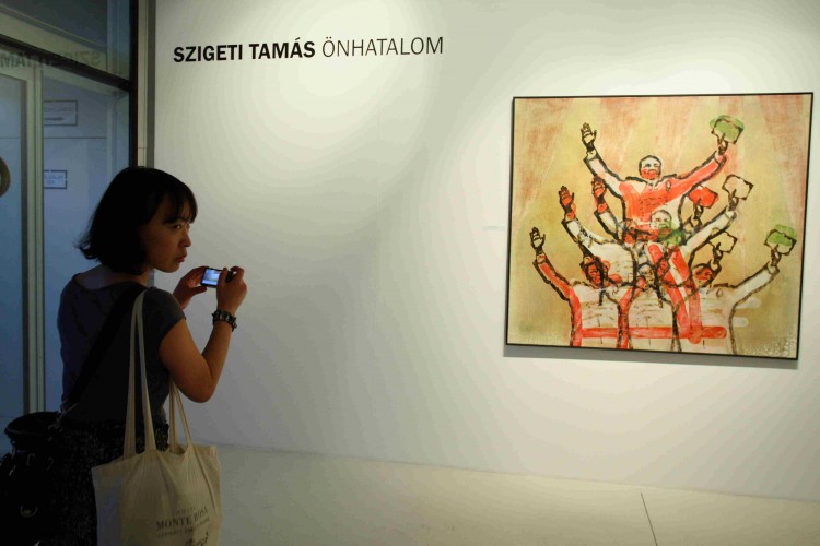 És persze ugyanezeket a kérdéseket visszatranszponálhatjuk a festményekbe is: mi a különbség a kései Árpád-korban bevezetett nyolc sávos vörös-fehér felségjel és a vele megtévesztésig azonosnak tűnő kortárs politikai címke között? Mi a különbség a sajtófotóvá stilizált asszonykórus lába alól előtörő barna megfolyás és a hokedlin parádézó közlekedési rendőr kabátjának színe között? Mi a különbség az Ígéret című képen megjelenő bohóc riasztó ágálása és a politikai hatos ikrek ugrócsoportja által bemutatott kunszt között? Mi a különbség a Hímzésre vetődő ebek hullahopp karikás produkciója és a Fényreklám párducainak acsarkodása között?