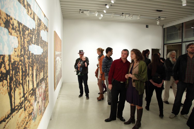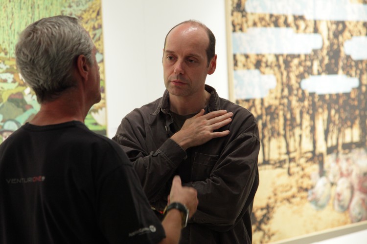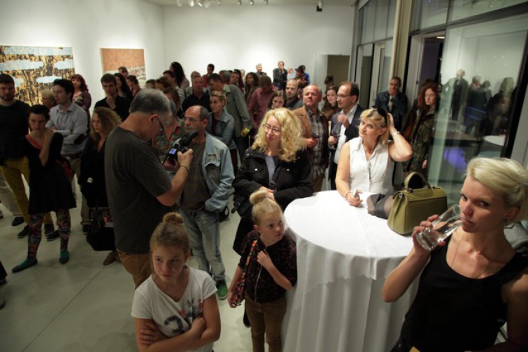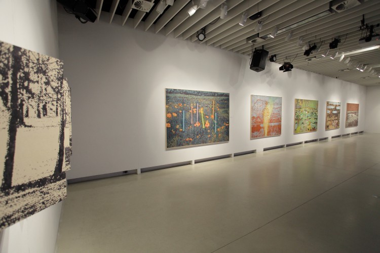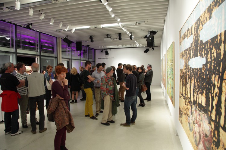 Valahol. A mostani kiállítás címe térbeliségre, valamely területre, vidékre utal, és teszi ezt a bizonytalanság, a keresés-kutatás érzetét keltve. Nagyvárosi tájképfestészet ez, áthatva a történelem lenyomataival. Leginkább egy militáns Monet-t képzeljünk el, aki a tavirózsák között felbukkanó hadi sisakokat megpillantva elhagyja az impresszionisták derűjét, és technikát vált.